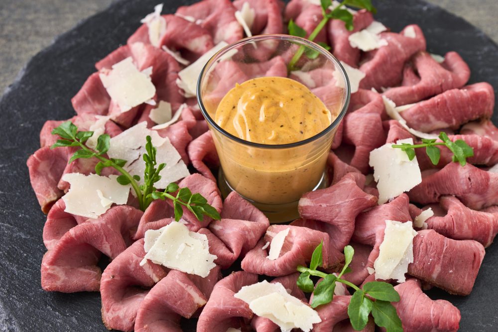 把烤牛肉做成了卡巴喬風格。這是推薦給喝酒的一道菜。